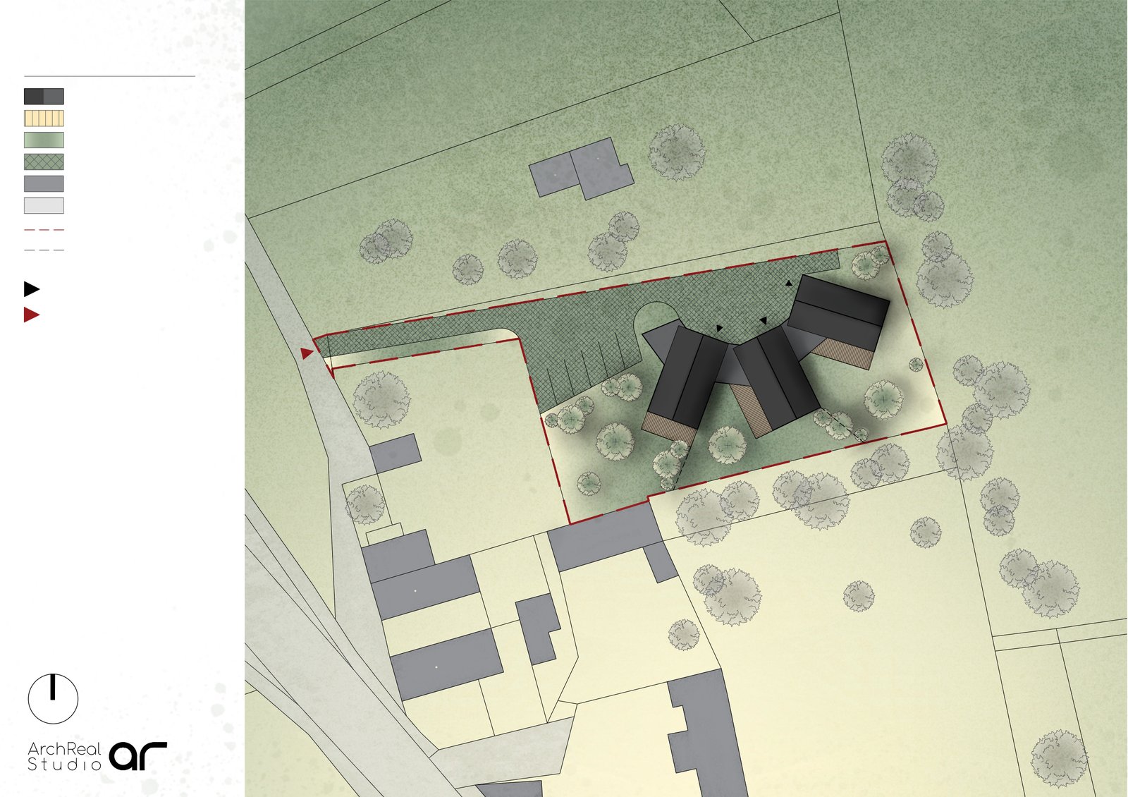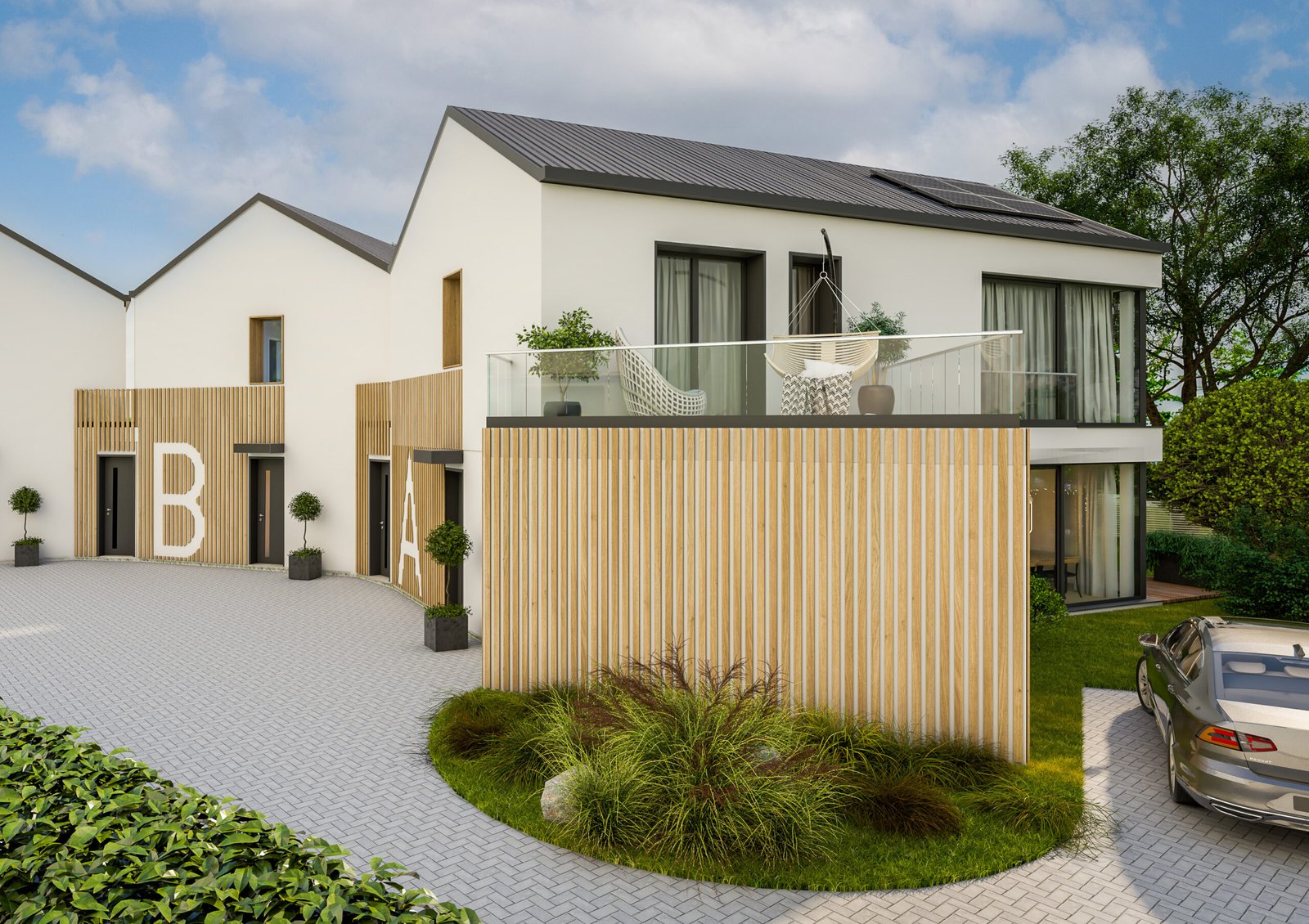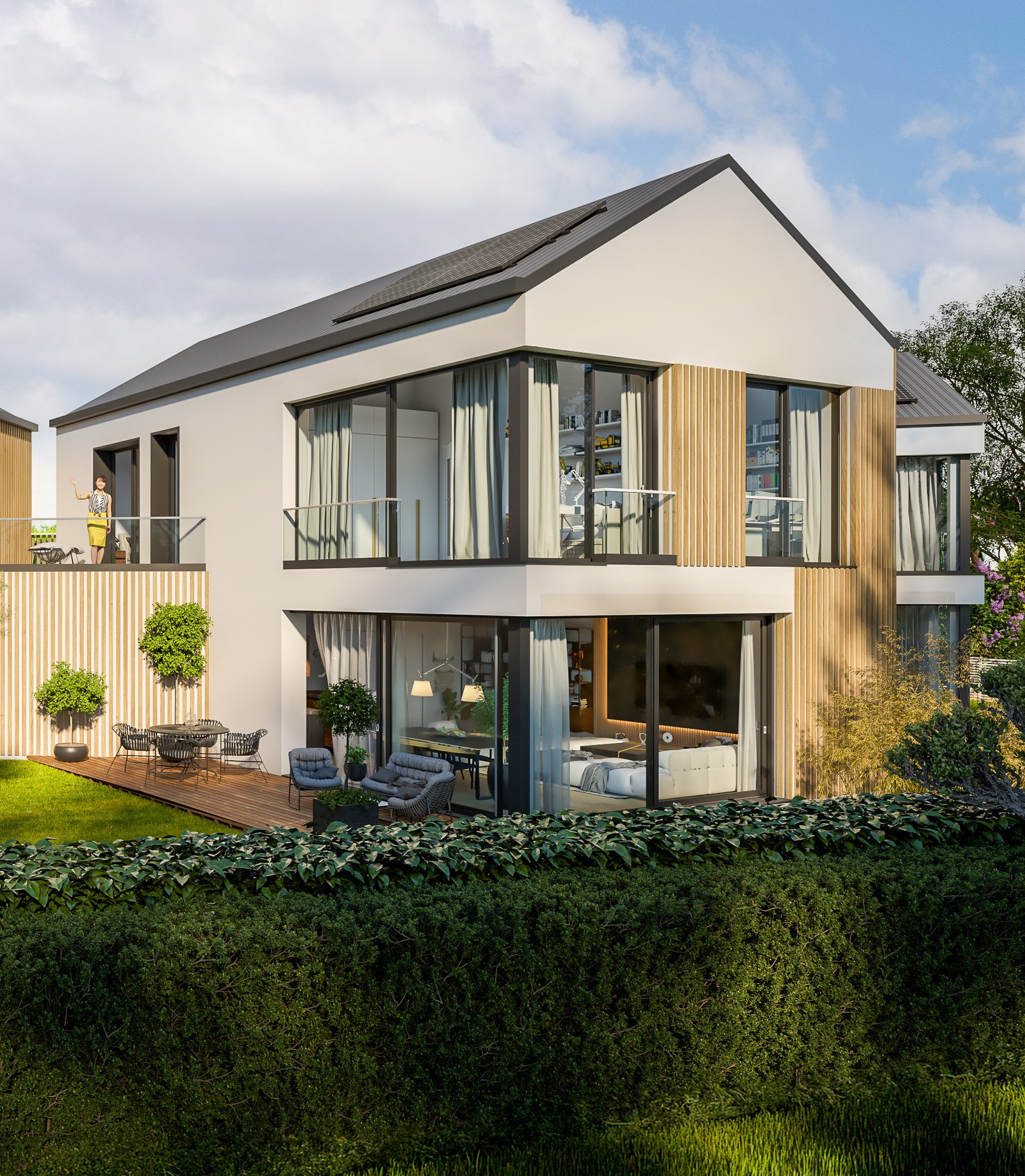 Chytrá architektura pro maximální soukromí Tento projekt je důkazem, že zahušťování zástavby v okolí Prahy lze dělat s ohledem na komfort budoucích obyvatel. Dům je navržen ve tvaru trojzubce orientovaného na jih. Díky tomuto uspořádání vznikají u každé jednotky přirozené “zálivy” pro terasu, které majitelům zaručují naprosté soukromí nerušené sousedy. Architektura respektuje tradiční sedlové střechy.