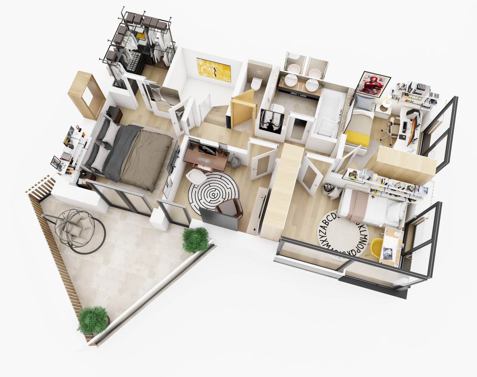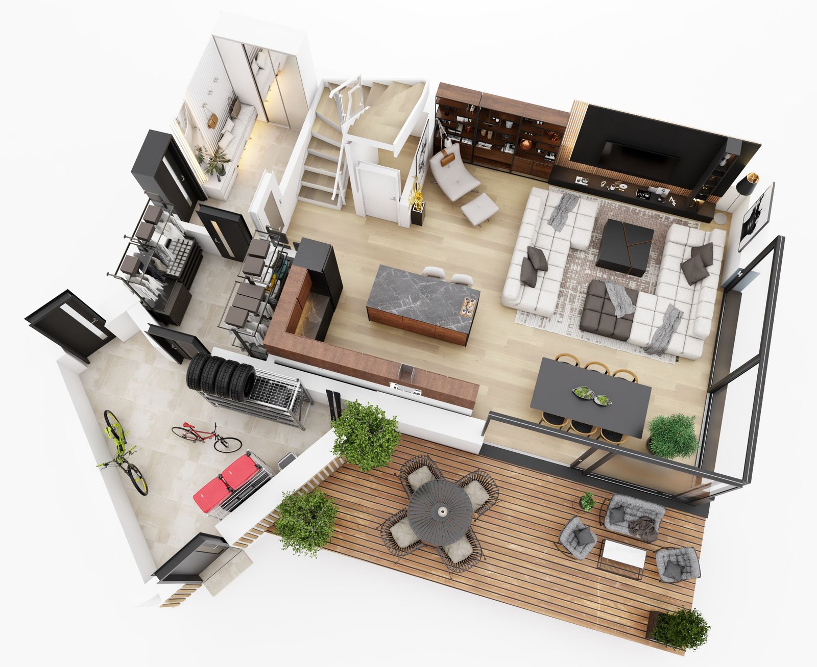 Logické uspořádání místností s dostatkem úložných prostor a technickým zázemím.